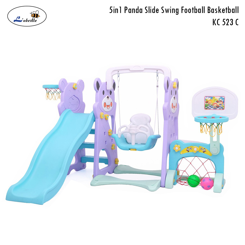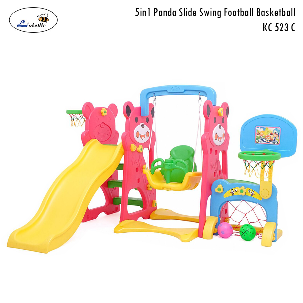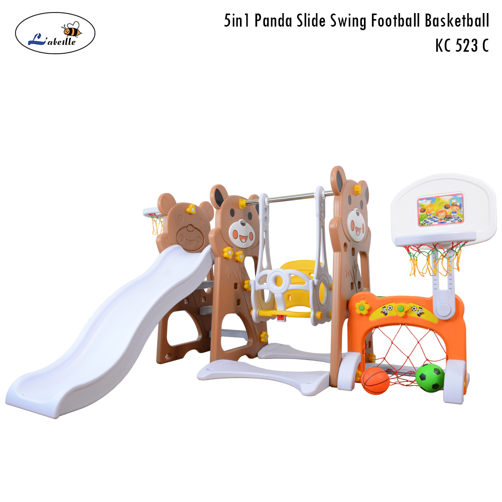 - Mainan perosotan dan ayunan yang dilengkapi dengan gawang sepakbola dan ring basket